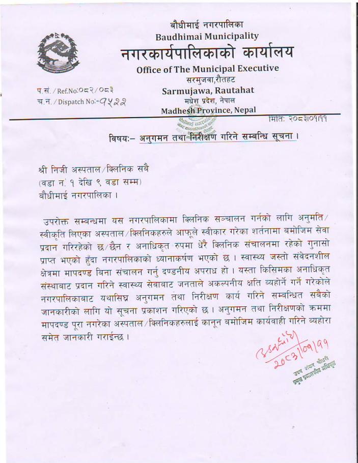 अनुगमन तथा निरीक्षण गरिने सम्बन्धि सूचना । श्री निजी अस्पताल/क्लिनिक सबै (वडा न. १ देखि ९ वडा सम्म) बौधीमाई नगरपालिका ।