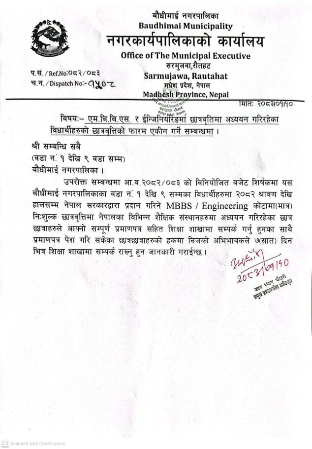 एम.बि.बि.एस. र ईन्जिनियरिङमा छात्रवृतिमा अध्ययन गरिरहेका विधार्थीहरुको छात्रवृत्तिको फारम एकीन गर्ने सम्बन्धमा ।