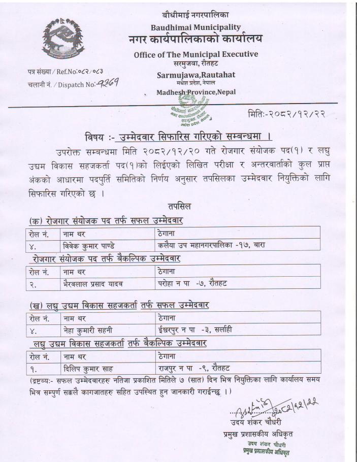 रोजगार संयोजक र लघु उद्यम विकास सहजकर्ता पदको अन्तिम नतिजा प्रकासन सम्बन्धमा ।