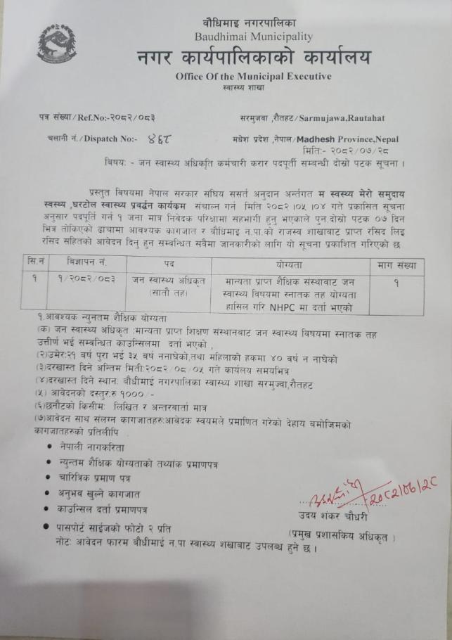 जन स्वास्थ्य अधिकृत कर्मचारी करार पदपूर्ती सम्बन्धी दोस्रो पटक सूचना ।