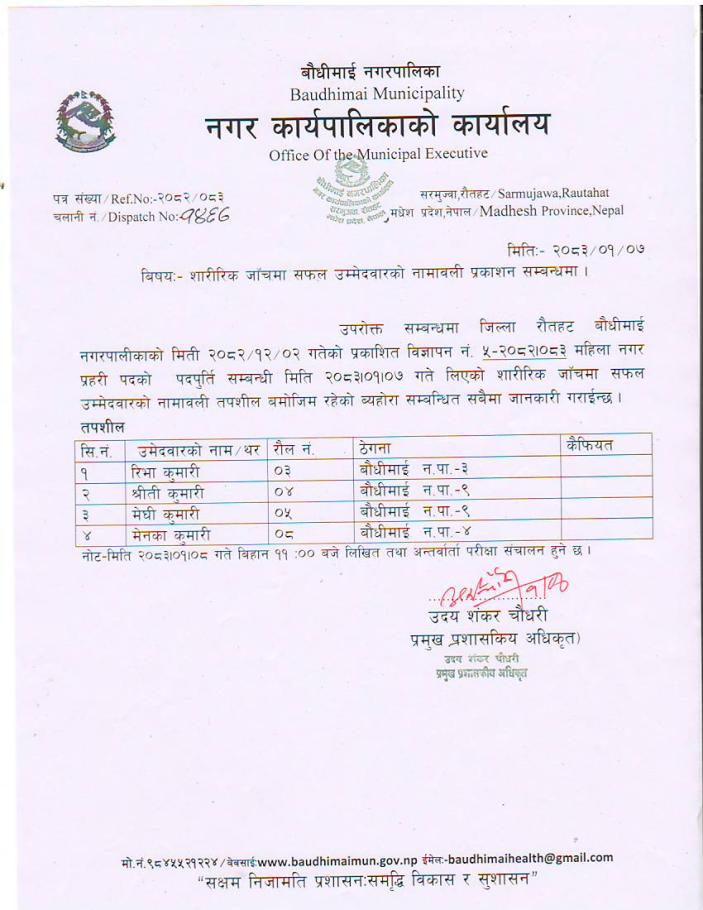 महिला नगर प्रहरी पदको शारीरिक जाँचमा सफल उम्मेदवारको नामावली प्रकाशन सम्बन्धमा ।