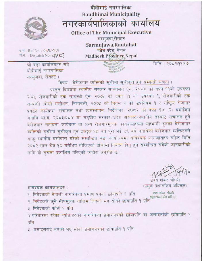 विषय : बेरोजगार व्यक्तिको सूचीमा सूचीकृत हुने सम्बन्धी सूचना ।