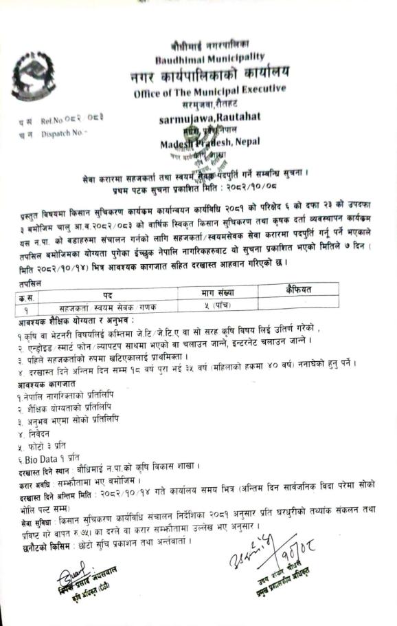 सेवा करारमा सहजकर्ता तथा स्वयम सेवक पदपुर्ति गर्ने सम्बन्धि सूचना । प्रथम पटक सुचना प्रकाशि मिति २०८२।१०।०८ गते